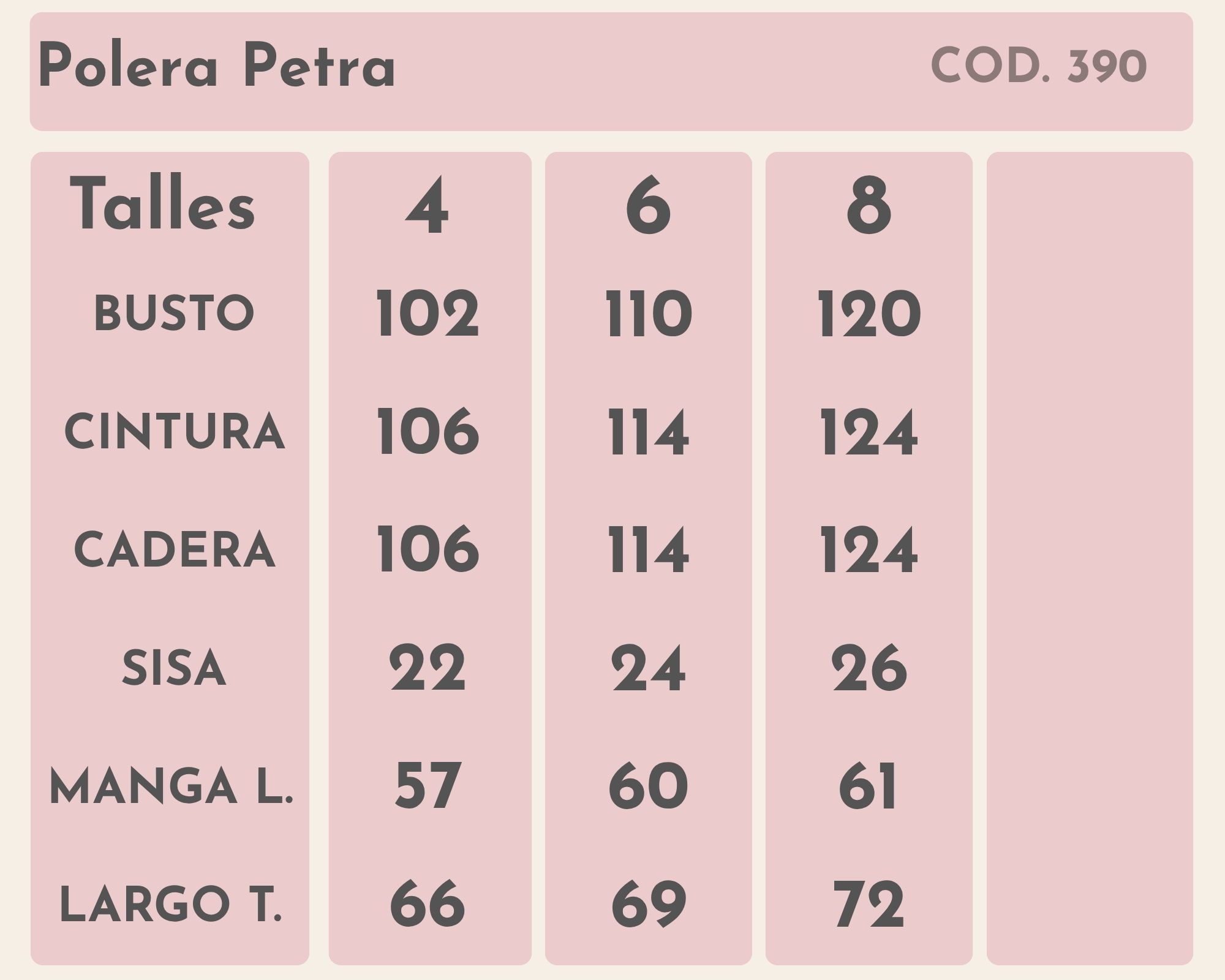 | Talle | 4, 6, 8 |